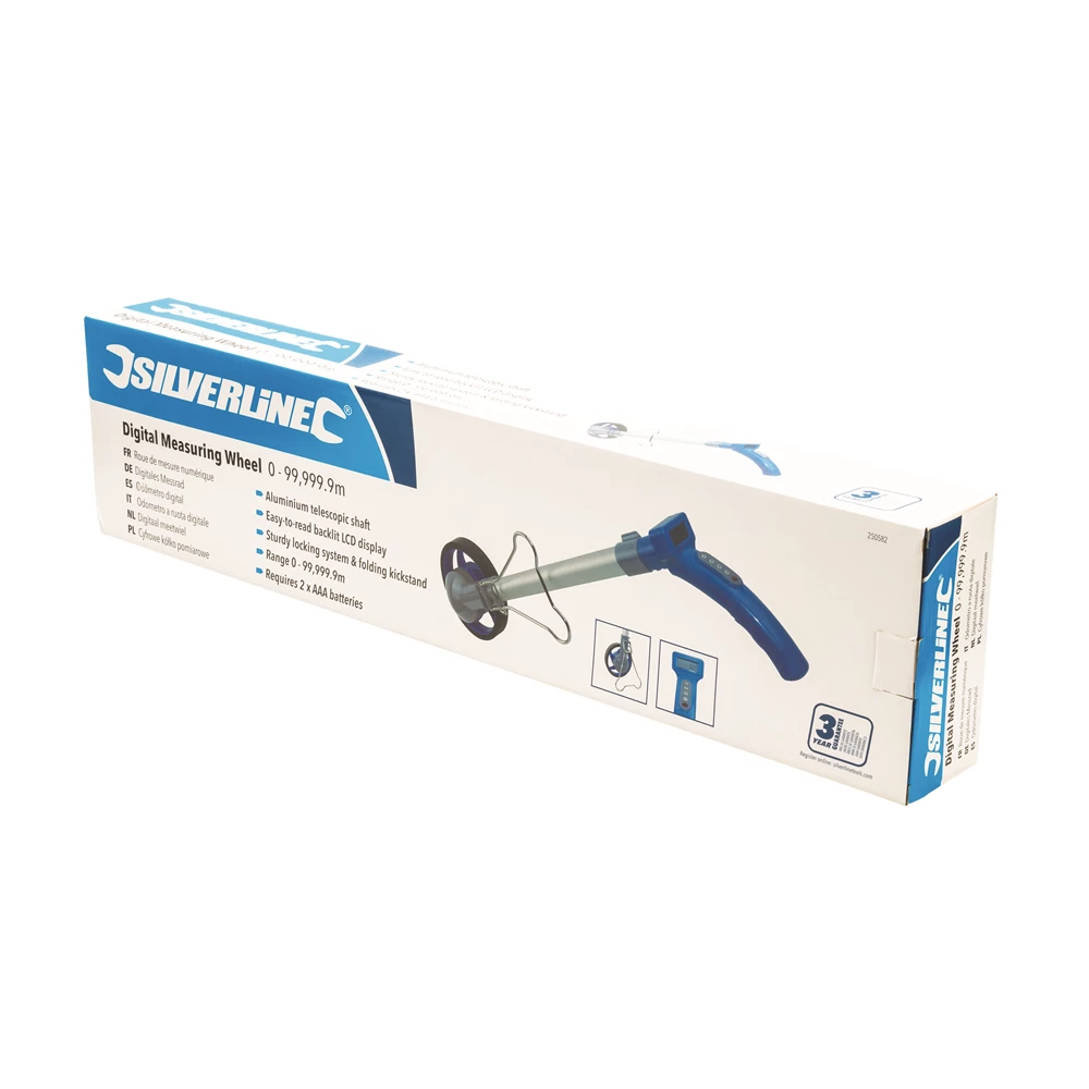 Teleskopstiel aus Aluminium mit stabilen Verankerungen und Klappständer. Erlaubt präzise Messungen im Messbereich bis 99.999,9 m. Sofortige Umrechnung von metrischen in zöllige Maßeinheiten. Leicht ablesbare, beleuchtete LCD-Anzeige am Handgriff. Datenspeicherung, Datenabruf und einfache Bedienung. Benötigt 2 Stck. AAA-Batterien.