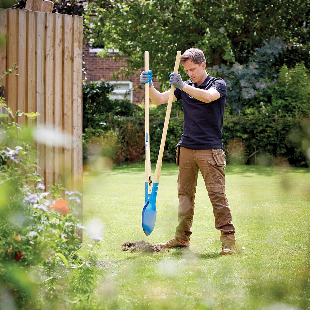 - Hardened, pressed, pointed leaf-shape steel blades for efficient digging