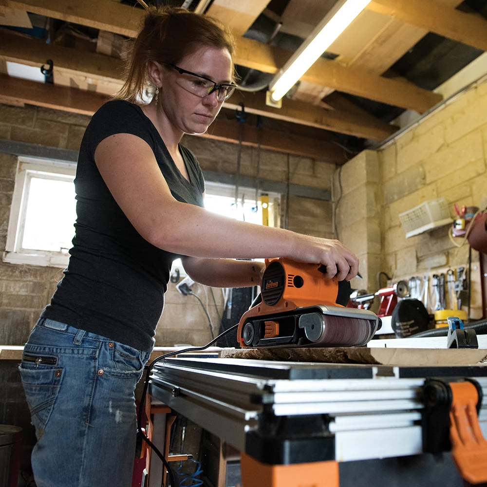 Powerful 1200W motor with variable speed control for rapid stock removal. Large 100 x 156mm sanding area. Belt-tracking adjustment for accurate alignment of sanding belt. Trigger control with lock-on button for continuous sanding. Rear-facing dust port connects to dust bag or vacuum dust extraction system. Belt size 100 x 610mm. Includes inversions clamps, bench-mounting mat, dust bag, 1 x spare drive belt and 3 x sanding belts (grits: 1 x 80 fitted, 1 x 100, 1 x 120). Weight: 6kg.